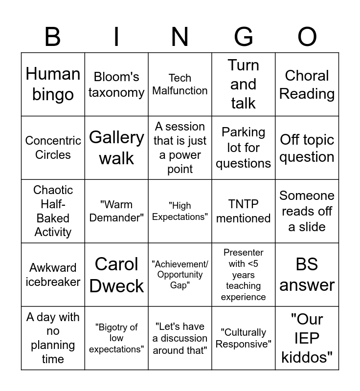 This bingo card has 35 words: "Unpack the standards", "Deep dive", Poster activity, Gallery walk, "Achievement/ Opportunity Gap", Turn and talk, Concentric Circles, "Oh I think we can do better than that!", A session that is just a power point, Kid-friendly attention getters, Chaotic Half-Baked Activity, Choral Reading, A session that could've been an email, Popcorn Reading, Human bingo, TNTP mentioned, "Culturally Responsive", "Warm Demander", Awkward icebreaker, "High Expectations", Presenter with <5 years teaching experience, A day with no planning time, BS answer, "Bigotry of low expectations", Tech Malfunction, Off topic question, "Our IEP kiddos", Equity vs equality, Parking lot for questions, Someone reads off a slide, "Growth Mindset", "Let's have a discussion around that", Carol Dweck, Bloom's taxonomy and "Rigor".