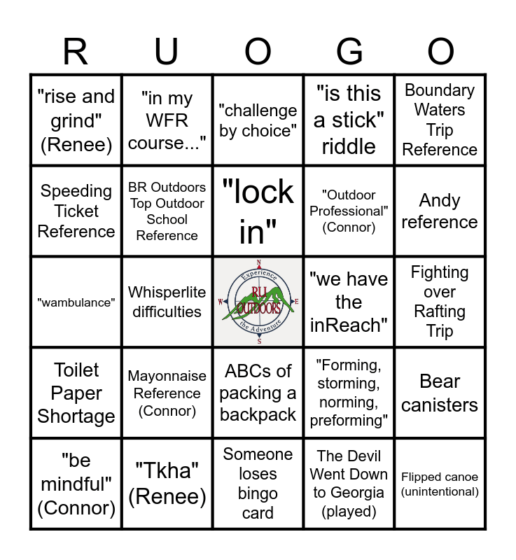 This bingo card has a free space and 24 words: Mayonnaise Reference (Connor), "Tkha" (Renee), "lock in", "be mindful" (Connor), Boundary Waters Trip Reference, "rise and grind" (Renee), Speeding Ticket Reference, "in my WFR course...", "we have the inReach", ABCs of packing a backpack, "Outdoor Professional" (Connor), "wambulance", "Forming, storming, norming, preforming", Bear canisters, BR Outdoors Top Outdoor School Reference, The Devil Went Down to Georgia (played), Fighting over Rafting Trip, "challenge by choice", Andy reference, Whisperlite difficulties, Flipped canoe (unintentional), Toilet Paper Shortage, "is this a stick" riddle and Someone loses bingo card.