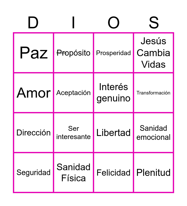 This bingo card has 1 images and 16 words: Sanidad Física, Sanidad emocional, Prosperidad, Paz, Dirección, Propósito, Libertad, Felicidad, Amor, Aceptación, Seguridad, Jesús Cambia Vidas, Ser interesante, Transformación, Interés genuino and Plenitud.