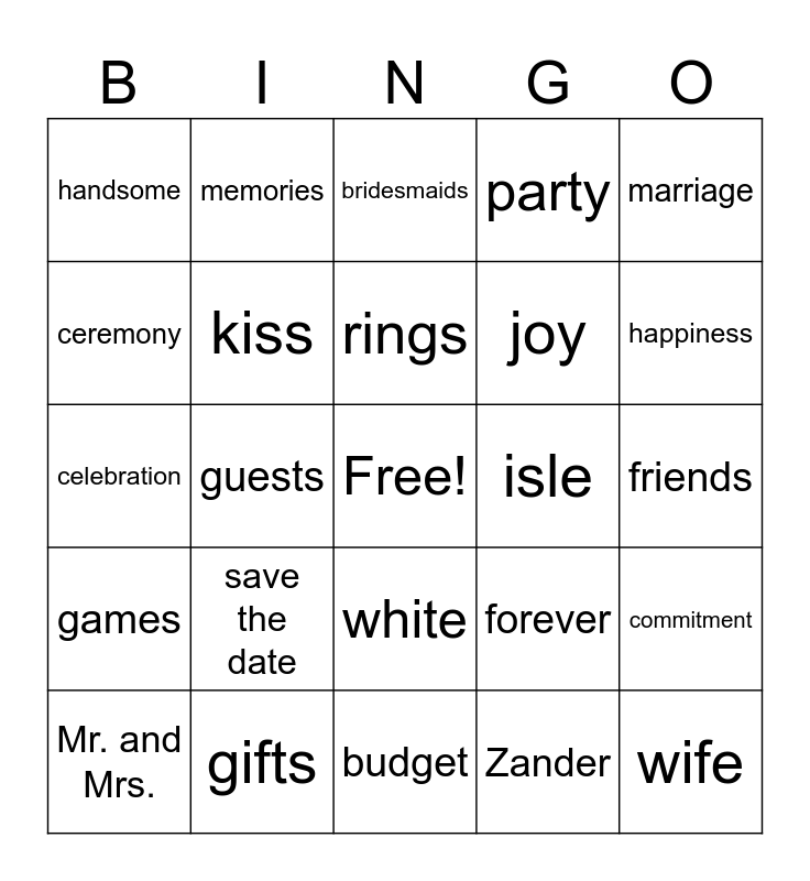 This bingo card has a free space and 76 words: veil, bouquet, bridesmaids, dress, bride, groom, love, vows, wedding, tux, dance, cake, rings, ceremony, reception, guests, groomsmen, wife, husband, marriage, proposal, celebration, kiss, memories, party, flowers, family, honeymoon, bestman, bridesmaid, maid of honor, best man, engaged, forever, happiness, joy, toast, decorations, friends, Zander, Clara, Robinson, Mrs., I do, first dance, diamond, Mr. and Mrs., handsome, beautiful, D.J., shower, white, couple, newlyweds, anniversary, September, flower girl, ring bearer, something blue, something borrowed, save the date, RSVP, registry, guest list, seating chart, plus one, isle, wedding planner, guest book, love story, commitment, games, gifts, photo booth, budget and DIY.
