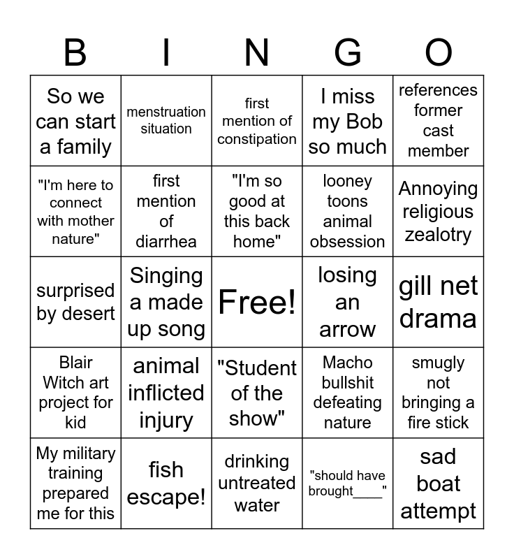 This bingo card has a free space and 29 words: My military training prepared me for this, I'm doing this for my [insert disability here] child, Singing a made up song, self injury, So we can start a family, first mention of constipation, first mention of diarrhea, animal inflicted injury, losing an arrow, fish escape!, gill net drama, sad boat attempt, drinking untreated water, "should have brought____", Annoying religious zealotry, "I'm missing my child's birthday", "Student of the show", Blair Witch art project for kid, references former cast member, surprised by desert, Macho bullshit defeating nature, crying over killing an animal, looney toons animal obsession, "I'm here to connect with mother nature", I miss my Bob so much, menstruation situation, smugly not bringing a fire stick, "I'm so good at this back home" and Shelter fire.