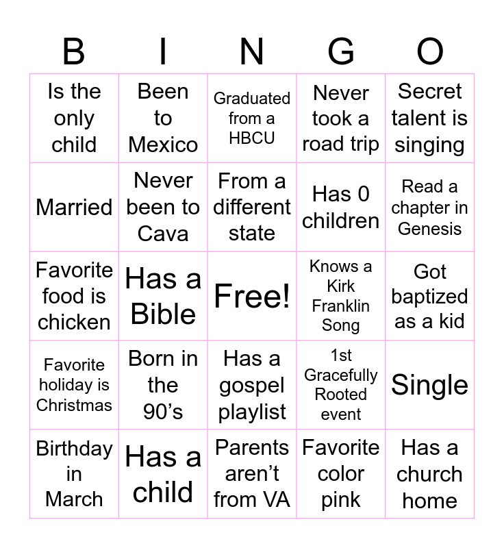 This bingo card has a free space and 24 words: Birthday in March, Born in the 90’s, From a different state, Favorite color pink, Secret talent is singing, Is the only child, Been to Mexico, Graduated from a HBCU, Knows a Kirk Franklin Song, Got baptized as a kid, Favorite food is chicken, Never been to Cava, 1st Gracefully Rooted event, Single, Married, Has a child, Parents aren’t from VA, Never took a road trip, Read a chapter in Genesis, Favorite holiday is Christmas, Has a Bible, Has a gospel playlist, Has 0 children and Has a church home.