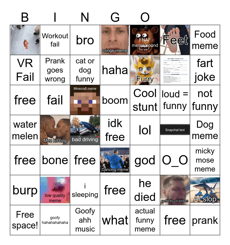 This bingo card has 14 images and 47 words: perfectly cut scream, actual funny meme, Men kissing, Minecraft meme, Dog meme, Workout fail, Goofy ahh music, Feet, Dancing meme, Food meme, cringe meme, loud = funny, Cool stunt, low quality meme, Snapchat text, VR Fail, fart joke, AI slop, FNAF meme/sound, Furry, bad driving, Prank goes wrong, Free space!, cat or dog funny, not funny, goofy hahahahahaha, boom, fail, prank, lol, burp, i sleeping, water melen, god, O_O, micky mose meme, free, free, free, free, idk free, what, haha, bro, he died, bone and free.