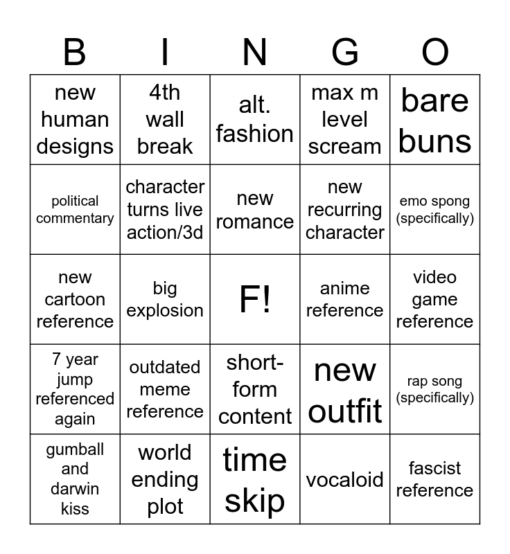 This bingo card has a free space and 24 words: outdated meme reference, world ending plot, new romance, gumball and darwin kiss, bare buns, new human designs, political commentary, 4th wall break, anime reference, short-form content, new recurring character, new cartoon reference, new outfit, rap song (specifically), character turns live action/3d, vocaloid, video game reference, alt. fashion, emo spong (specifically), big explosion, fascist reference, 7 year jump referenced again, max m level scream and time skip.