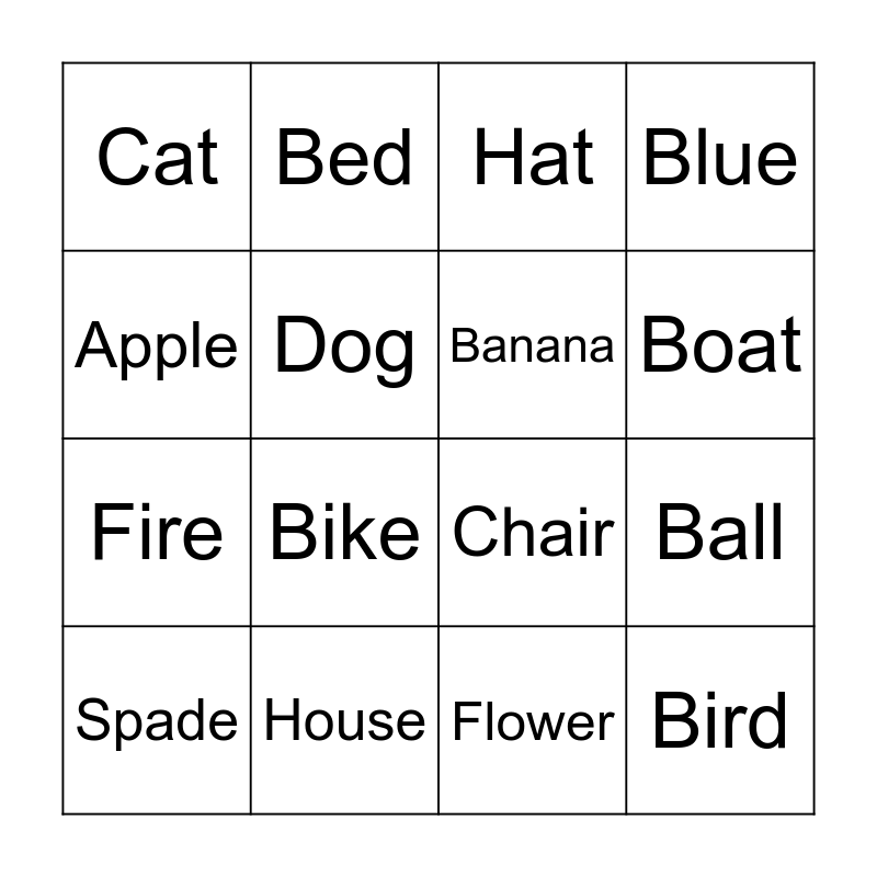 This bingo card has 20 words: Ball, Cup, Hat, Tree, Spade, Apple, House, Cat, Fire, Bed, Bike, Chair, Dog, Bird, Banana, Belt, Boat, Blue, Flower and Pen.