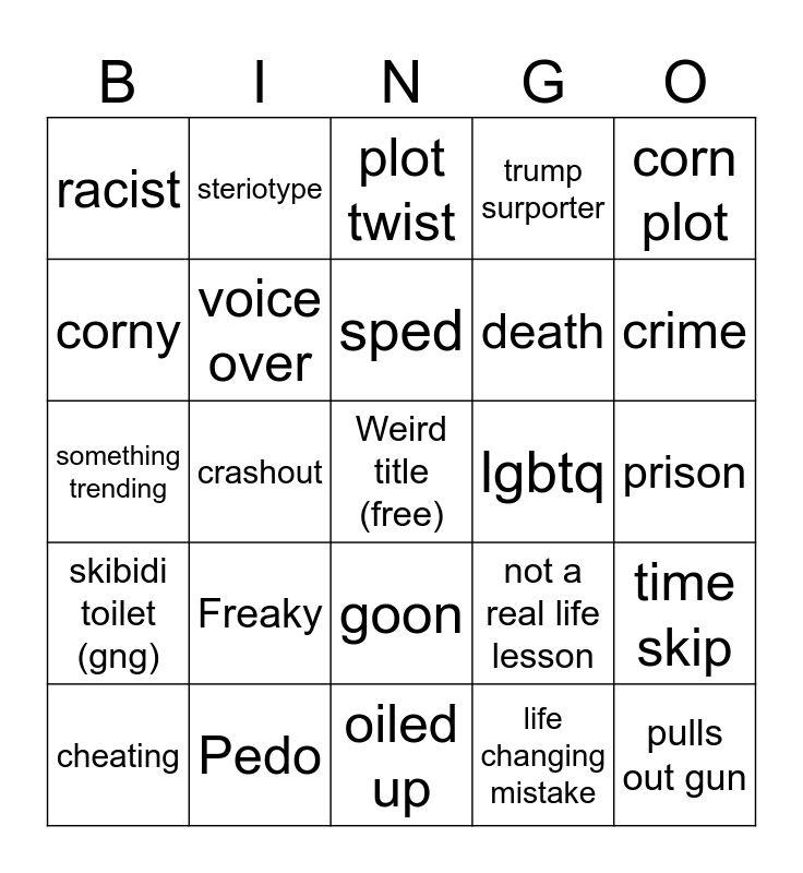 This bingo card has a free space and 24 words: Freaky, Pedo, sped, cheating, corn plot, racist, corny, steriotype, lgbtq, goon, death, something trending, not a real life lesson, time skip, voice over, life changing mistake, prison, plot twist, crime, crashout, pulls out gun, skibidi toilet (gng), trump surporter and oiled up.
