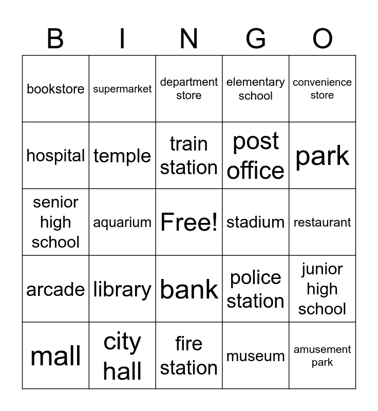 This bingo card has a free space and 27 words: police station, pharmacy, post office, fire station, hospital, department store, supermarket, arcade, stadium, junior high school, senior high school, elementary school, mall, city hall, park, shrine, temple, train station, library, bookstore, restaurant, museum, aquarium, amusement park, bank, convenience store and grocery store.