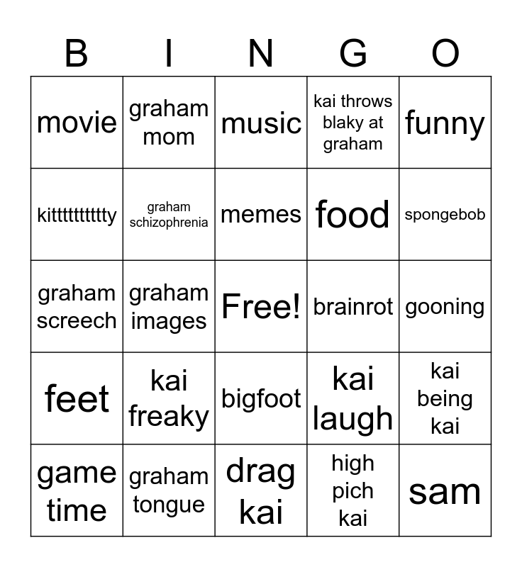 This bingo card has a free space and 24 words: kai freaky, graham tongue, memes, game time, funny, movie, kitttttttttty, graham mom, brainrot, bigfoot, food, graham screech, kai laugh, kai being kai, graham schizophrenia, high pich kai, gooning, music, spongebob, graham images, sam, feet, kai throws blaky at graham and drag kai.