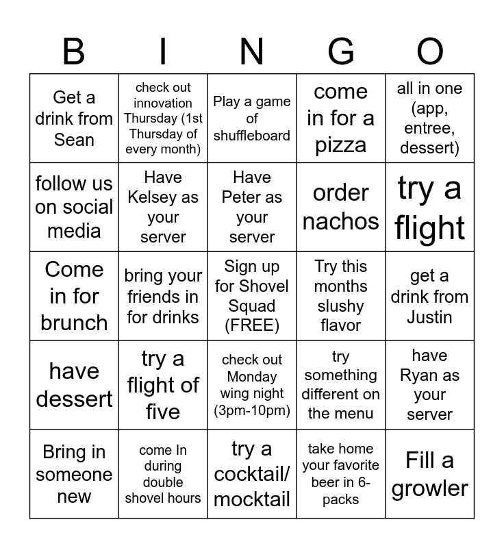 This bingo card has a free space and 24 words: Bring in someone new, try a flight of five, Have Peter as your server, take home your favorite beer in 6-packs, all in one (app, entree, dessert), Get a drink from Sean, check out innovation Thursday (1st Thursday of every month), Play a game of shuffleboard, Try this months slushy flavor, get a drink from Justin, Come in for brunch, Have Kelsey as your server, try something different on the menu, have Ryan as your server, follow us on social media, come In during double shovel hours, try a cocktail/ mocktail, come in for a pizza, try a flight, have dessert, bring your friends in for drinks, check out Monday wing night (3pm-10pm), order nachos and Fill a growler.