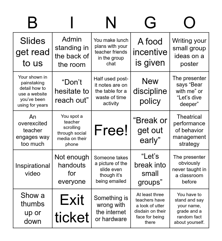 This bingo card has a free space and 24 words: Not enough handouts for everyone, Exit ticket, Half used post-it notes are on the table for a waste of time activity, Show a thumbs up or down, Writing your small group ideas on a poster, Slides get read to us, Your shown in painstaking detail how to use a website you’ve been using for years, Admin standing in the back of the room, “Break or get out early”, Someone takes a picture of the slide even though it’s being emailed, New discipline policy, An overexcited teacher engages way too much, “Let’s break into small groups”, The presenter obviously never taught in a classroom before, “Don’t hesitate to reach out”, At least three teachers have a look of utter disdain on their face for being there, Theatrical performance of behavior management strategy, You make lunch plans with your teacher friends in the group chat, The presenter says “Bear with me” or “Let’s dive deeper”, You spot a teacher scrolling through social media on their phone, You have to stand and say your name, grade and a random fact about yourself., Inspirational video, A food incentive is given and Something is wrong with the internet or hardware.