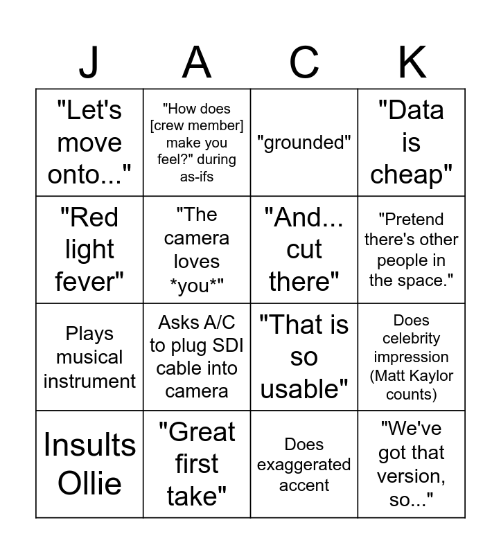 This bingo card has 16 words: "Great first take", Does celebrity impression (Matt Kaylor counts), "grounded", "Let's move onto...", Plays musical instrument, "How does [crew member] make you feel?" during as-ifs, "That is so usable", Does exaggerated accent, "Red light fever", "The camera loves *you*", Insults Ollie, "Data is cheap", Asks A/C to plug SDI cable into camera, "Pretend there's other people in the space.", "And... cut there" and "We've got that version, so...".