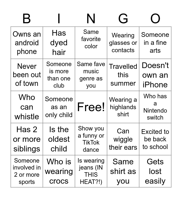 This bingo card has a free space and 34 words: owns a rodent as a pet, Same shirt as you, Same astrology sign as you, Has visited another state, Has 2 or more siblings, Someone is more than one club, Someone in a fine arts, Someone involved in 2 or more sports, Has dyed hair, Who is wearing converse shoes, Same fave music genre as you, Same favorite color, Allergic to peanuts/any nuts, Summer birthday, Wearing a highlands shirt, Doesn't own an iPhone, Who is wearing crocs, Who can whistle, Is the oldest child, Can wiggle their ears, Show you a funny or TikTok dance, Came to Leadership came b/c a friend is here, Owns an android phone, Who has a Nintendo switch, Is wearing jeans (IN THIS HEAT?!), Gets lost easily, Wearing glasses or contacts, Has piercings or tattoos, Travelled this summer, Never been out of town, Has a cat, Someone as an only child, Excited to be back to school and Is scared to drive.