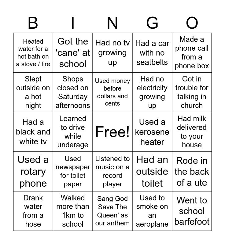 This bingo card has a free space and 24 words: Used newspaper for toilet paper, Walked more than 1km to school, Used money before dollars and cents, Drank water from a hose, Made a phone call from a phone box, Heated water for a hot bath on a stove / fire, Slept outside on a hot night, Got the 'cane' at school, Used a kerosene heater, Listened to music on a record player, Had no electricity growing up, Had a black and white tv, Had an outside toilet, Rode in the back of a ute, Shops closed on Saturday afternoons, Used to smoke on an aeroplane, Had milk delivered to your house, Had no tv growing up, Got in trouble for talking in church, Learned to drive while underage, Went to school barfefoot, Used a rotary phone, Had a car with no seatbelts and Sang God Save The Queen' as our anthem.