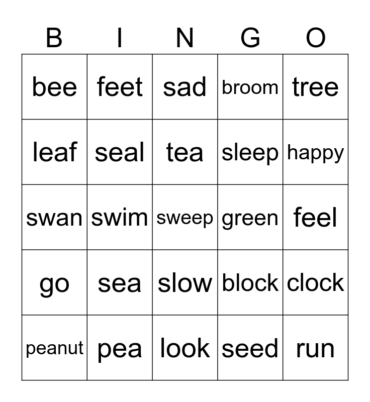 This bingo card has a free space and 24 words: sea, pea, tea, peanut, tree, bee, leaf, feet, green, slow, sleep, swan, block, clock, seal, seed, feel, sad, happy, swim, run, go, broom and look.