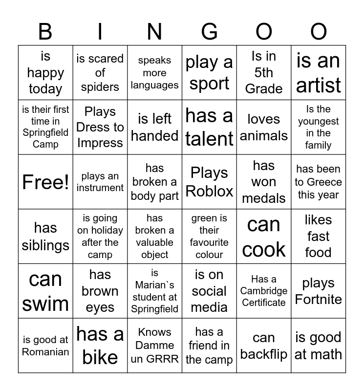 This bingo card has 36 words: is on social media, is Marian`s student at Springfield, has a friend in the camp, is their first time in Springfield Camp, has siblings, Plays Roblox, Plays Dress to Impress, Knows Damme un GRRR, Is in 5th Grade, Has a Cambridge Certificate, Is the youngest in the family, play a sport, plays Fortnite, plays an instrument, has a talent, is happy today, can swim, has won medals, Free!, speaks more languages, has broken a body part, is going on holiday after the camp, green is their favourite colour, has broken a valuable object, can cook, is scared of spiders, loves animals, has a bike, is left handed, is an artist, is good at math, is good at Romanian, likes fast food, has been to Greece this year, has brown eyes and can backflip.