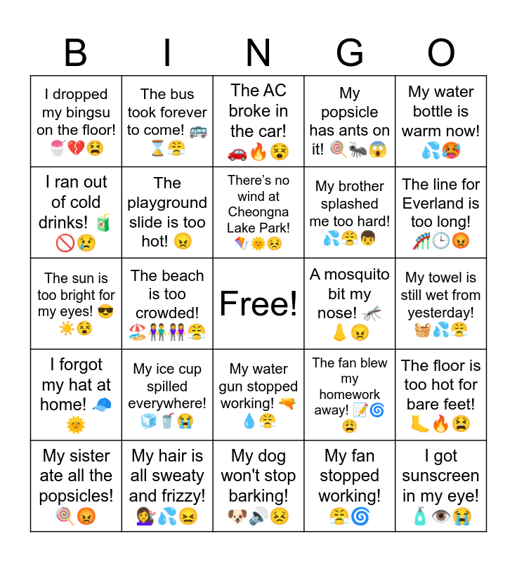 This bingo card has a free space and 34 words: My ice cream melted too fast! π¦π, My fan stopped working! π€π, Thereβs no shade in the park! π³βοΈπ©, I wanted melon bingsu, but they were sold out! π₯π§π’, I forgot my hat at home! π§’π, The playground slide is too hot! π , My water bottle is warm now! π¦π₯΅, My sister ate all the popsicles! ππ‘, The bus took forever to come! πβπ€, I stepped on something squishy! π¦Άπͺ±π±, Thereβs no wind at Cheongna Lake Park! πͺππ£, The AC broke in the car! ππ₯π΅, My shirt is sticky! ππ¦π¬, My flip-flop broke at Homeplus! π©΄π€, A mosquito bit my nose! π¦ππ , The line for Everland is too long! π’ππ‘, My hair is all sweaty and frizzy! πββοΈπ¦π, The sun is too bright for my eyes! πβοΈπ΅, My ice cup spilled everywhere! π§π₯€π, The fan blew my homework away! πππ©, My water gun stopped working! π«π§π€, The Wi-Fi is too slow! π±π’π , I dropped my bingsu on the floor! π§ππ«, My towel is still wet from yesterday! π§Ίπ¦π€, My dog won't stop barking! πΆππ£, I got sunscreen in my eye! π§΄ποΈπ, My popsicle has ants on it! πππ±, The AC is on, but itβs still hot! π§π‘οΈπ , My brother splashed me too hard! π¦π€π¦, I ran out of cold drinks! π§π«π’, My favorite cartoon is not on TV! πΊπ ββοΈπ‘, The beach is too crowded! ποΈπ«ππ€, The floor is too hot for bare feet! π¦Άπ₯π« and The wind blew my snack away! πͺππ.