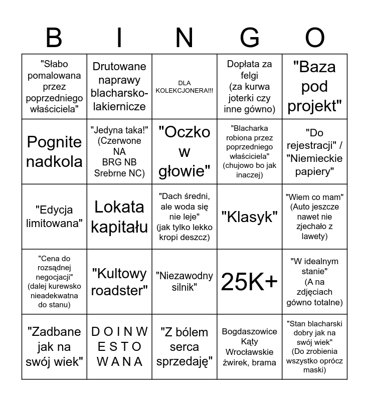 This bingo card has 25 words: "Kultowy roadster", "Z bólem serca sprzedaję", "Oczko w głowie", "Zadbane jak na swój wiek", "Baza pod projekt", "Słabo pomalowana przez poprzedniego właściciela", Pognite nadkola, Drutowane naprawy blacharsko-lakiernicze, "Klasyk", "Niezawodny silnik", "Blacharka robiona przez poprzedniego właściciela" (chujowo bo jak inaczej), "Edycja limitowana", 25K+, "W idealnym stanie" (A na zdjęciach gówno totalne), "Jedyna taka!" (Czerwone NA BRG NB Srebrne NC), "Stan blacharski dobry jak na swój wiek" (Do zrobienia wszystko oprócz maski), "Wiem co mam" (Auto jeszcze nawet nie zjechało z lawety), DLA KOLEKCJONERA!!!, "Do rejestracji" / "Niemieckie papiery", Lokata kapitału, "Dach średni, ale woda się nie leje" (jak tylko lekko kropi deszcz), D O I N W E S T O W A N A, "Cena do rozsądnej negocjacji" (dalej kurewsko nieadekwatna do stanu), Dopłata za felgi (za kurwa joterki czy inne gówno) and Bogdaszowice Kąty Wrocławskie żwirek, brama.