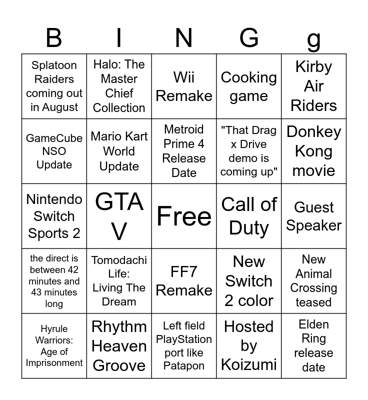 This bingo card has a free space and 24 words: Tomodachi Life: Living The Dream, Rhythm Heaven Groove, Metroid Prime 4 Release Date, Hyrule Warriors: Age of Imprisonment, Kirby Air Riders, Splatoon Raiders coming out in August, GameCube NSO Update, Halo: The Master Chief Collection, Call of Duty, FF7 Remake, "That Drag x Drive demo is coming up", Nintendo Switch Sports 2, New Switch 2 color, New Animal Crossing teased, Mario Kart World Update, Hosted by Koizumi, Guest Speaker, Wii Remake, Donkey Kong movie, GTA V, Elden Ring release date, the direct is between 42 minutes and 43 minutes long, Cooking game and Left field PlayStation port like Patapon.
