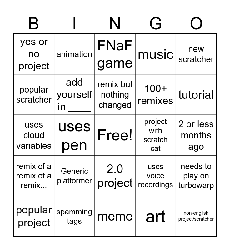 This bingo card has a free space and 24 words: Generic platformer, spamming tags, remix but nothing changed, popular project, new scratcher, yes or no project, popular scratcher, animation, project with scratch cat, 2.0 project, 100+ remixes, uses cloud variables, uses voice recordings, needs to play on turbowarp, add yourself in ____, art, 2 or less months ago, FNaF game, tutorial, uses pen, non-english project/scratcher, remix of a remix of a remix..., music and meme.