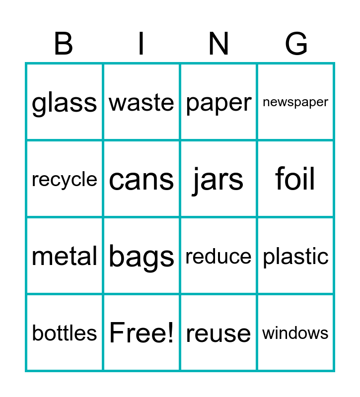 This bingo card has 16 words: Free!, plastic, paper, glass, metal, waste, reduce, reuse, recycle, cans, bottles, newspaper, bags, foil, jars and windows.