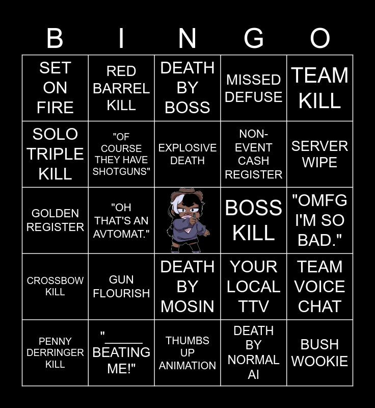 This bingo card has a free space and 49 words: SNIPER HEADSHOT, BUSH WOOKIE, BAT/KATANA KILL, THUMBS UP ANIMATION, GUN FLOURISH, DEATH CHEAT FIND, RED BARREL KILL, SPAWN FIGHT, SOLO TRIPLE KILL, EVERY. SOUND TRAP. EVER., "OF COURSE THEY HAVE SHOTGUNS", MISSED DEFUSE, TEAM VOICE CHAT, YOUR LOCAL TTV, THIRD PARTY, "OH THAT'S A NITRO.", EXPLOSIVE DEATH, BOSS KILL, DOUBLE BOUNTY EXTRACTION, TEAM KILL, "OH THAT'S AN AVTOMAT.", DEATH BY NORMAL AI, SET ON FIRE, NON-EVENT CASH REGISTER, SOLO NECRO, SERVER WIPE, PENNY DERRINGER KILL, SPEAR KILL, DEATH BY MOSIN, CROSSBOW KILL, BLEW UP IMMOLATOR, DARK SATCHEL BOMB KILL, ONE HEALTH BAR KILL, BOUNTY REVIVE, "_____ BEATING ME!", "PEOPLE!" CALL OUT, "STFU I CAN'T HEAR.", THE RAIIIIN, "OMFG I'M SO BAD.", TOXIC CHATTERS :(, ENEMY VOICE CHAT, GAMER VISITS TWITCH CHAT, "TRADED.", BLOOD BOND SACK, GOLDEN REGISTER, DEATH BY BOSS, DEATH BY SPECIAL AI, FANNING FIEND / LEVERING LEECH and RAMPAGE REDEMPTION.