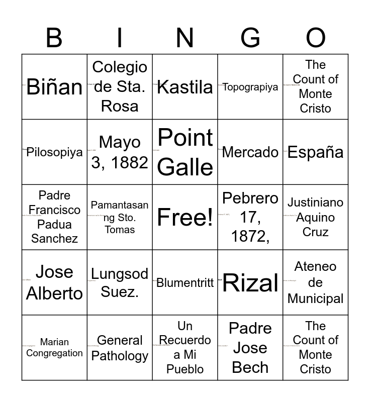 This bingo card has 27 images, a free space and 27 words: Rizal, Calamba, Mercado, Un Recuerdo a Mi Pueblo, Pilosopiya, Kastila, Colegio de Sta. Rosa, Jose Alberto, Pebrero 17, 1872,, Ateneo de Municipal, Padre Francisco Padua Sanchez, Topograpiya, Marian Congregation, General Pathology, España, Salvadorra, Mayo 3, 1882, Point Galle, Lungsod Suez., Biñan, Justiniano Aquino Cruz, Padre Jose Bech, Pamantasan ng Sto. Tomas, The Count of Monte Cristo, Blumentritt, The Count of Monte Cristo and interno (Romano) at di-interno (Kartahena).