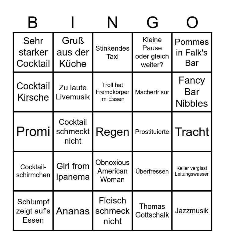This bingo card has 25 words: Girl from Ipanema, Fleisch schmeck nicht, Troll hat Fremdkörper im Essen, Schlumpf zeigt auf's Essen, Pommes in Falk's Bar, Sehr starker Cocktail, Cocktail Kirsche, Gruß aus der Küche, Prostituierte, Obnoxious American Woman, Macherfrisur, Promi, Überfressen, Keller vergisst Leitungswasser, Zu laute Livemusik, Jazzmusik, Tracht, Stinkendes Taxi, Fancy Bar Nibbles, Cocktail schmeckt nicht, Regen, Ananas, Cocktail- schirmchen, Kleine Pause oder gleich weiter? and Thomas Gottschalk.