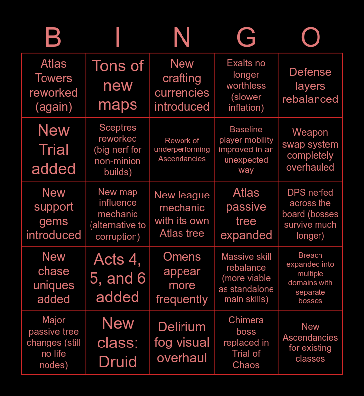 This bingo card has a free space and 24 words: Acts 4, 5, and 6 added, New class: Druid, Rework of underperforming Ascendancies, Major passive tree changes (still no life nodes), Defense layers rebalanced, Atlas Towers reworked (again), New Trial added, Tons of new maps, Atlas passive tree expanded, Omens appear more frequently, Baseline player mobility improved in an unexpected way, New support gems introduced, Massive skill rebalance (more viable as standalone main skills), Breach expanded into multiple domains with separate bosses, Sceptres reworked (big nerf for non-minion builds), Chimera boss replaced in Trial of Chaos, DPS nerfed across the board (bosses survive much longer), New crafting currencies introduced, Weapon swap system completely overhauled, New map influence mechanic (alternative to corruption), New Ascendancies for existing classes, New chase uniques added, Exalts no longer worthless (slower inflation) and Delirium fog visual overhaul.