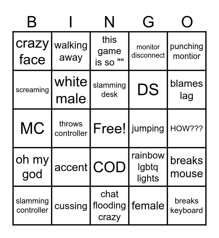 This bingo card has a free space and 24 words: accent, cussing, slamming desk, slamming controller, punching montior, crazy face, screaming, walking away, jumping, COD, DS, MC, rainbow lgbtq lights, breaks mouse, white male, female, HOW???, this game is so "", blames lag, throws controller, breaks keyboard, oh my god, monitor disconnect and chat flooding crazy.