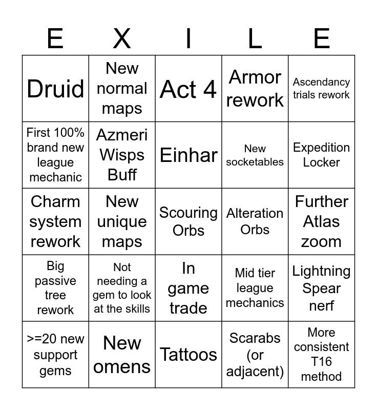 This bingo card has 35 words: Div Cards, Chronomancer Buffs, >=30 new uniques, Azmeri Wisps Buff, In game trade, Armor rework, First 100% brand new league mechanic, Big Atlas tree rework, Einhar, Mapping checkpoint improvements, Charm system rework, Ascendancy trials rework, 3rd Ascendancies for more classes, Addressing networking issues, Druid, Alteration Orbs, Scarabs (or adjacent), New unique maps, Big passive tree rework, Scouring Orbs, Mid tier league mechanics, >=20 new support gems, Lightning Spear nerf, New omens, Act 4, Expedition Locker, More consistent T16 method, Cluster Jewels, New socketables, Further Atlas zoom, Mageblood, Tattoos, Not needing a gem to look at the skills, New normal maps and New pinnacle boss.