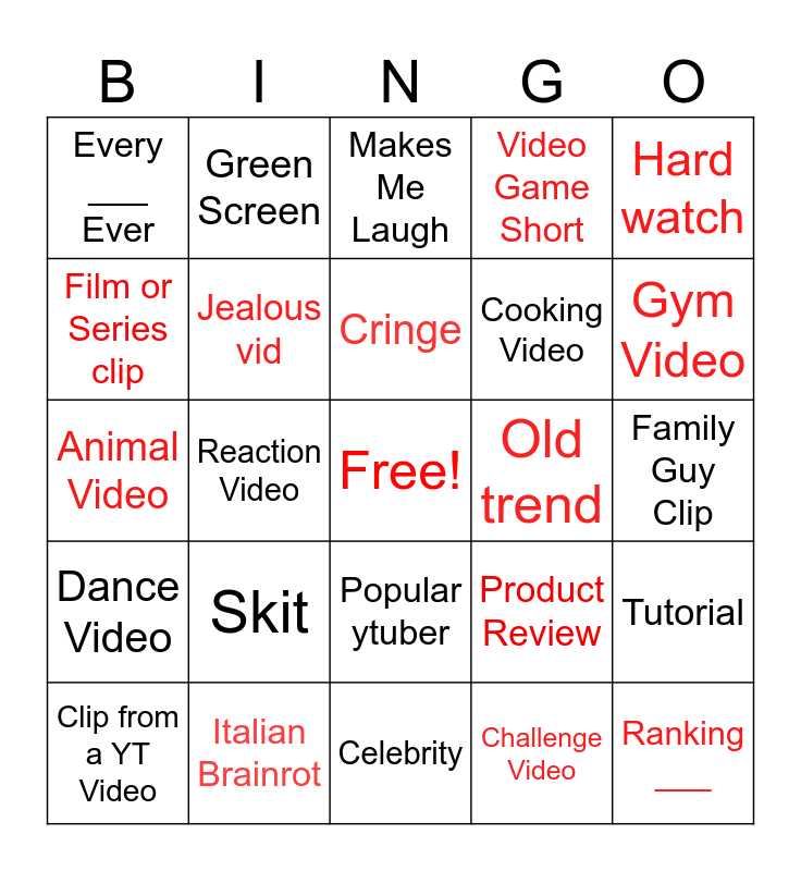 This bingo card has a free space and 24 words: Skit, Italian Brainrot, Cringe, Clip from a YT Video, Hard watch, Every ___ Ever, Film or Series clip, Green Screen, Old trend, Popular ytuber, Cooking Video, Animal Video, Product Review, Tutorial, Jealous vid, Challenge Video, Family Guy Clip, Makes Me Laugh, Gym Video, Reaction Video, Ranking ___, Dance Video, Video Game Short and Celebrity.