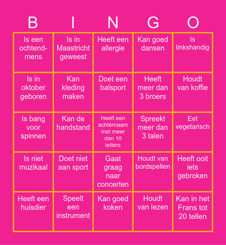 This bingo card has a free space and 24 words: Doet niet aan sport, Speelt een instrument, Doet een balsport, Heeft een huisdier, Is linkshandig, Is een ochtend-mens, Is in oktober geboren, Is in Maastricht geweest, Spreekt meer dan 3 talen, Gaat graag naar concerten, Heeft meer dan 3 broers, Is bang voor spinnen, Houdt van bordspellen, Heeft ooit iets gebroken, Kan kleding maken, Houdt van lezen, Eet vegetarisch, Heeft een allergie, Houdt van koffie, Kan de handstand, Kan in het Frans tot 20 tellen, Is niet muzikaal, Kan goed dansen and Kan goed koken.
