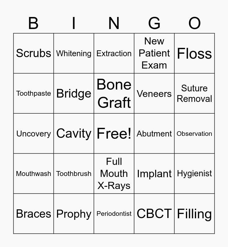 This bingo card has a free space and 31 words: Periodontist, Prosthodontist, Cavity, Crown, Scrubs, Extraction, Bridge, Implant, Abutment, CBCT, Observation, Filling, Amalgam, Nitrous Oxide, Suture Removal, Denture, Hygienist, Toothbrush, Mouthwash, Full Mouth X-Rays, Floss, Halcion, Braces, Whitening, Veneers, Toothpaste, New Patient Exam, Uncovery, Prophy, Bone Graft and Perio Maintenance.