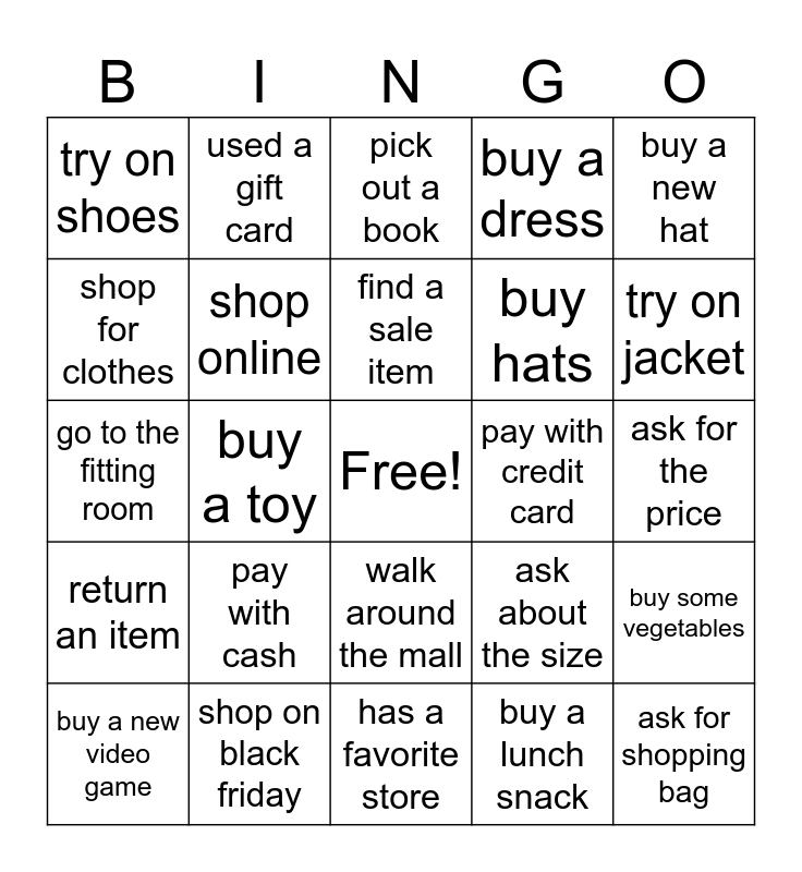 This bingo card has a free space and 24 words: buy a new video game, pay with cash, find a sale item, buy a lunch snack, buy a new hat, try on shoes, used a gift card, pick out a book, pay with credit card, ask for the price, go to the fitting room, shop online, ask about the size, buy some vegetables, shop for clothes, shop on black friday, has a favorite store, buy a dress, try on jacket, return an item, buy a toy, walk around the mall, buy hats and ask for shopping bag.