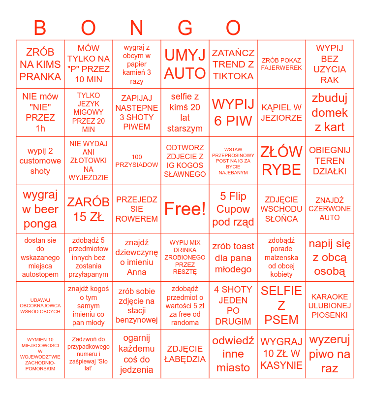 This bingo card has a free space and 48 words: 4 SHOTY JEDEN PO DRUGIM, KĄPIEL W JEZIORZE, ZDJĘCIE ŁABĘDZIA, ZARÓB 15 ZŁ, 100 PRZYSIADOW, ZNAJDŹ CZERWONE AUTO, MÓW TYLKO NA "P" PRZEZ 10 MIN, Zadzwoń do przypadkowego numeru i zaśpiewaj 'Sto lat’, ZRÓB POKAZ FAJERWEREK, WYPIJ MIX DRINKA ZROBIONEGO PRZEZ RESZTĘ, WYPIJ BEZ UZYCIA RAK, UMYJ AUTO, ZŁÓW RYBE, WSTAW PRZEPROSINOWY POST NA IG ZA BYCIE NAJEBANYM, UDAWAJ OBCOKRAJOWCA WŚRÓD OBCYCH, ZDJĘCIE WSCHODU SŁOŃCA, NIE mów "NIE" PRZEZ 1h, zbuduj domek z kart, SELFIE Z PSEM, ZATAŃCZ TREND Z TIKTOKA, WYPIJ 6 PIW, PRZEJEDZ SIE ROWEREM, ZRÓB NA KIMS PRANKA, TYLKO JEZYK MIGOWY PRZEZ 20 MIN, KARAOKE ULUBIONEJ PIOSENKI, ZAPIJAJ NASTEPNE 3 SHOTY PIWEM, OBIEGNIJ TEREN DZIAŁKI, WYMIEN 10 MIEJSCOWOSCI W WOJEWODZTWIE ZACHODNIO-POMORSKIM, ODTWORZ ZDJECIE Z IG KOGOS SŁAWNEGO, NIE WYDAJ ANI ZŁOTOWKI NA WYJEZDZIE, WYGRAJ 10 ZŁ W KASYNIE, 5 Flip Cupow pod rząd, napij się z obcą osobą, znajdź kogoś o tym samym imieniu co pan młody, wygraj w beer ponga, zrób toast dla pana młodego, zdobądź porade malzenska od obcej kobiety, wypij 2 customowe shoty, znajdź dziewczynę o imieniu Anna, zrób sobie zdjęcie na stacji benzynowej, dostan sie do wskazanego miejsca autostopem, wyzeruj piwo na raz, wygraj z obcym w papier kamień 3 razy, ogarnij każdemu coś do jedzenia, selfie z kimś 20 lat starszym, zdobądź przedmiot o wartości 5 zł za free od randoma, zdobądź 5 przedmiotow innych bez zostania przyłapanym and odwiedź inne miasto.