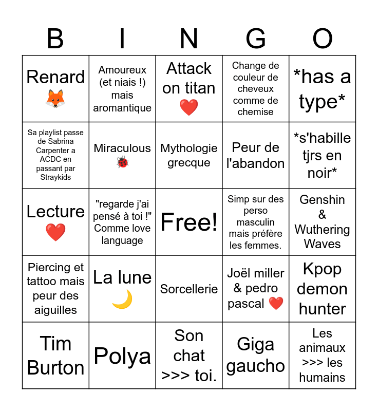 This bingo card has a free space and 24 words: Tim Burton, La lune 🌙, Mythologie grecque, Giga gaucho, *has a type*, Renard 🦊, Amoureux (et niais !) mais aromantique, Attack on titan ❤️, Simp sur des perso masculin mais préfère les femmes., Genshin & Wuthering Waves, Lecture ❤️, Miraculous 🐞, Joël miller & pedro pascal ❤️, Kpop demon hunter, Sa playlist passe de Sabrina Carpenter a ACDC en passant par Straykids, Polya, Son chat >>> toi., Change de couleur de cheveux comme de chemise, *s'habille tjrs en noir*, Piercing et tattoo mais peur des aiguilles, "regarde j'ai pensé à toi !" Comme love language, Sorcellerie, Peur de l'abandon and Les animaux >>> les humains.