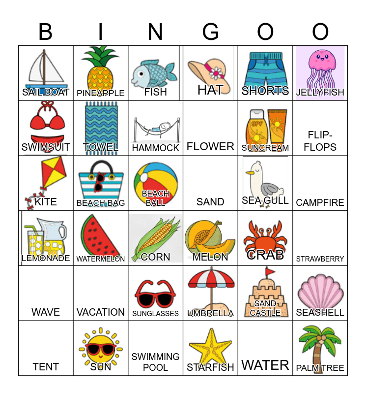 This bingo card has 26 images and 36 words: UMBRELLA, SUNGLASSES, STARFISH, SWIMSUIT, LEMONADE, SAND, TOWEL, SWIMMING POOL, SHORTS, SAND CASTLE, FLIP-FLOPS, HAT, SEASHELL, BEACH BAG, FLOWER, SAIL BOAT, WAVE, SEA GULL, KITE, FISH, BEACH BALL, WATERMELON, MELON, CORN, CRAB, PINEAPPLE, SUNCREAM, SUN, HAMMOCK, JELLYFISH, PALM TREE, TENT, STRAWBERRY, CAMPFIRE, VACATION and WATER.