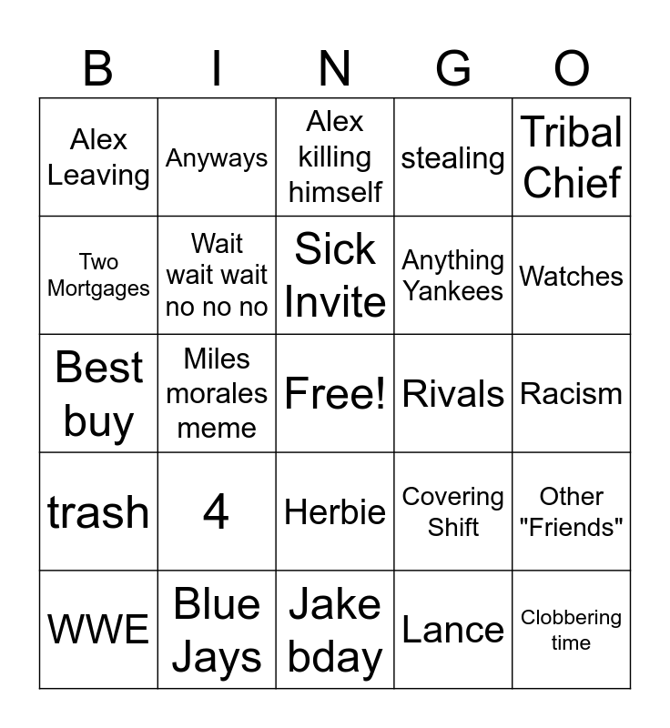 This bingo card has a free space and 24 words: 4, Blue Jays, Sick Invite, WWE, Tribal Chief, Alex Leaving, Two Mortgages, Anyways, Rivals, Herbie, Anything Yankees, Best buy, Covering Shift, Other "Friends", Wait wait wait no no no, Lance, Racism, Alex killing himself, Watches, Miles morales meme, Clobbering time, trash, stealing and Jake bday.