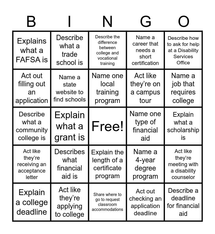 This bingo card has a free space and 24 words: Describes what financial aid is, Act like they’re applying to college, Name one local training program, Explain a college deadline, Describe how to ask for help at a Disability Services Office, Explains what a FAFSA is, Act out filling out an application, Describe what a trade school is, Name one type of financial aid, Explain the length of a certificate program, Act like they’re on a campus tour, Describe what a community college is, Name a 4-year degree program, Act like they’re meeting with a disability counselor, Name a state website to find schools, Act out checking an application deadline, Explain what a scholarship is, Describe the difference between college and vocational training, Name a job that requires college, Explain what a grant is, Describe a deadline for financial aid, Act like they’re receiving an acceptance letter, Name a career that needs a short certification and Share where to go to request classroom accommodations.