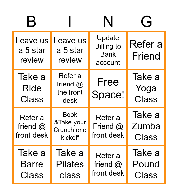 This bingo card has 19 words: Refer a Friend @ front desk, Follow us on social media, Update Billing to Bank account, Take a Pound Class, Take a Zumba Class, Take a Ride Class, Refer a friend @ front desk, Leave us a 5 star review, Leave us a 5 star review, Refer a friend @ front desk, Book &Take your Crunch one kickoff, Refer a friend @ the front desk, Free Space!, Take a Pilates class, Take a Barre Class, Update billing to Bank account, Refer a Friend, Take a Yoga Class and Take your Crunch one Kickoff.