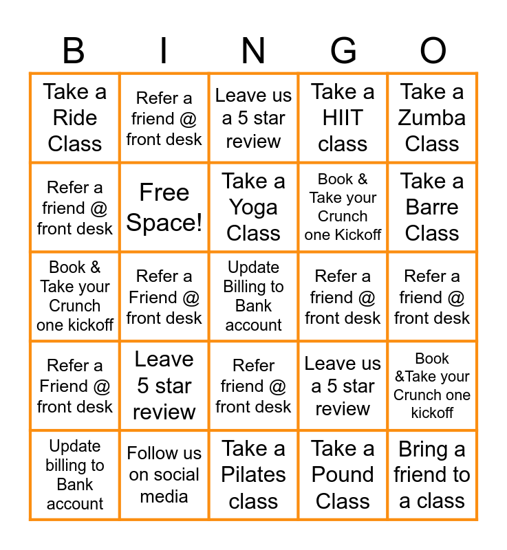 This bingo card has 25 words: Refer a Friend @ front desk, Follow us on social media, Update Billing to Bank account, Take a Pound Class, Take a Zumba Class, Take a Ride Class, Refer a friend @ front desk, Leave us a 5 star review, Refer a friend @ front desk, Book &Take your Crunch one kickoff, Refer a friend @ front desk, Free Space!, Take a Pilates class, Leave us a 5 star review, Take a Barre Class, Update billing to Bank account, Refer a Friend @ front desk, Take a Yoga Class, Book & Take your Crunch one Kickoff, Refer a friend @ front desk, Book & Take your Crunch one kickoff, Leave 5 star review, Refer friend @ front desk, Take a HIIT class and Bring a friend to a class.