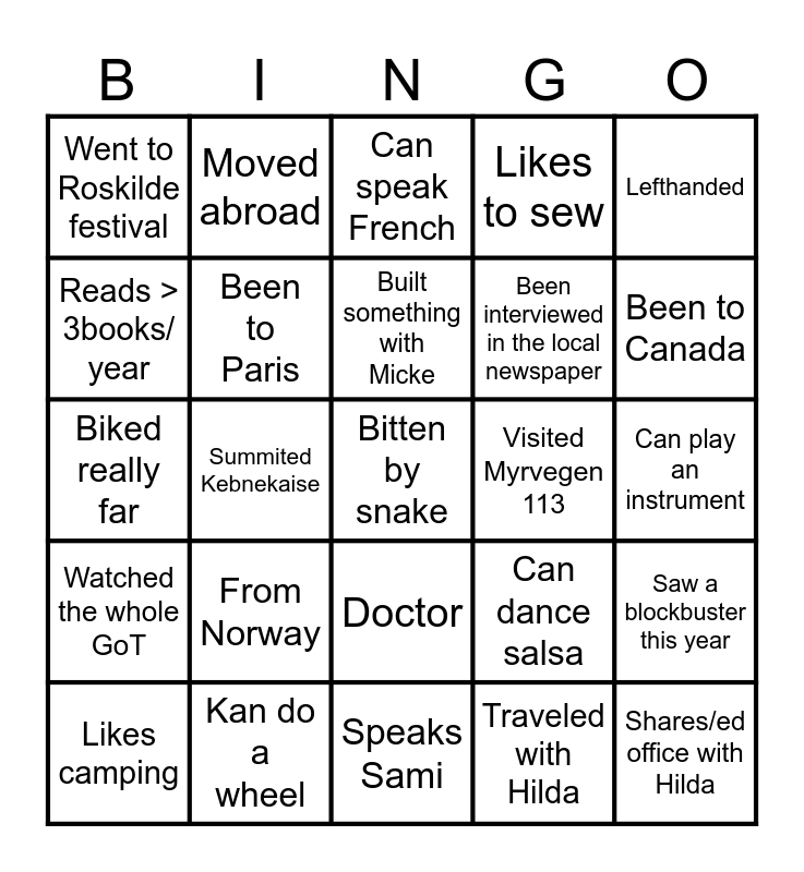 This bingo card has a free space and 64 words: Loves Eurovision, Bikes downhill, Has divinglicence, Saw a blockbuster this year, Have a cat, Has walked sherpastairs in Tromsø, Moved abroad, Took a swim in Arctic sea this summer, Built something with Micke, Ran a halfmarathon, Doctor, Loves waffles with browncheese, Can play an instrument, Lefthanded, Is nervous, Reads > 3books/ year, Summited Kebnekaise, Went to Roskilde festival, Been down the mine in Kiruna, Been interviewed in the local newspaper, From Norway, Watched the whole GoT, Likes to sew, Retired, Been skiing with Micke, Loves to SUP, Skydived, Preferes snowmobile >ATV, Loves photography, Has worked as bartender, Plays CDs, From sweden, Can ride a horse, Can surf, Been to Canada, Likes camping, Preferes winter, Traveled with Hilda, Been to Svalbard, Been to Paris, Biked really far, Visited Myrvegen 113, Has competed in multisport with Micke, Is toastmaster, Skis every year in Lyngen, Shares/ed office with Hilda, Kan do a wheel, Is an artist, Can dance salsa, Worked in a school, Lives in Kiruna, Is related to Micke, Speaks Sami, Nurse, Loves nighttrain, Have 3 kids or more, Can speak French, Have a dog, Climber, Been to Hawaii, First time in Lyngen, Has flown a plane, Been to Nordkap and Can speak spanish.