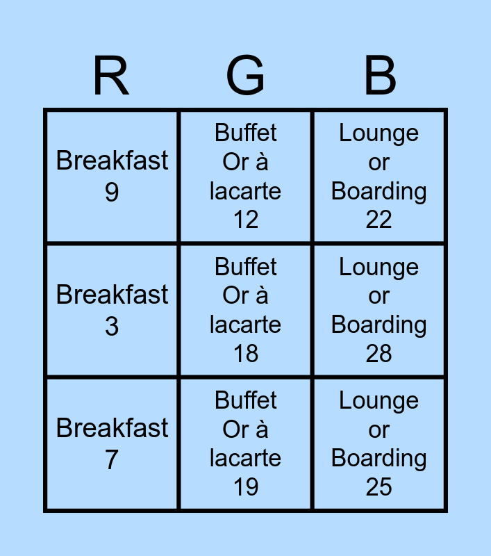 This bingo card has 30 words: Breakfast 1, Buffet Or à lacarte 11, Lounge or Boarding 21, Breakfast 2, Buffet Or à lacarte 12, Lounge or Boarding 22, Breakfast 3, Buffet Or à lacarte 13, Lounge or Boarding 23, Breakfast 4, Buffet Or à lacarte 14, Lounge or Boarding 24, Breakfast 5, Buffet Or à lacarte 15, Lounge or Boarding 25, Breakfast 6, Buffet Or à lacarte 16, Lounge or Boarding 26, Breakfast 7, Buffet Or à lacarte 17, Lounge or Boarding 27, Breakfast 8, Buffet Or à lacarte 18, Lounge or Boarding 28, Breakfast 9, Buffet Or à lacarte 19, Lounge or Boarding 29, Breakfast 10, Buffet Or à lacarte 20 and Lounge or Boarding 30.