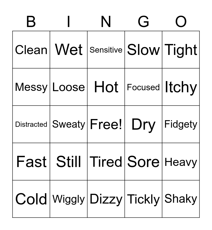 This bingo card has a free space and 24 words: Still, Wiggly, Hot, Cold, Tight, Clean, Messy, Wet, Dry, Tired, Focused, Distracted, Sore, Heavy, Loose, Tickly, Fidgety, Sensitive, Itchy, Sweaty, Shaky, Fast, Slow and Dizzy.