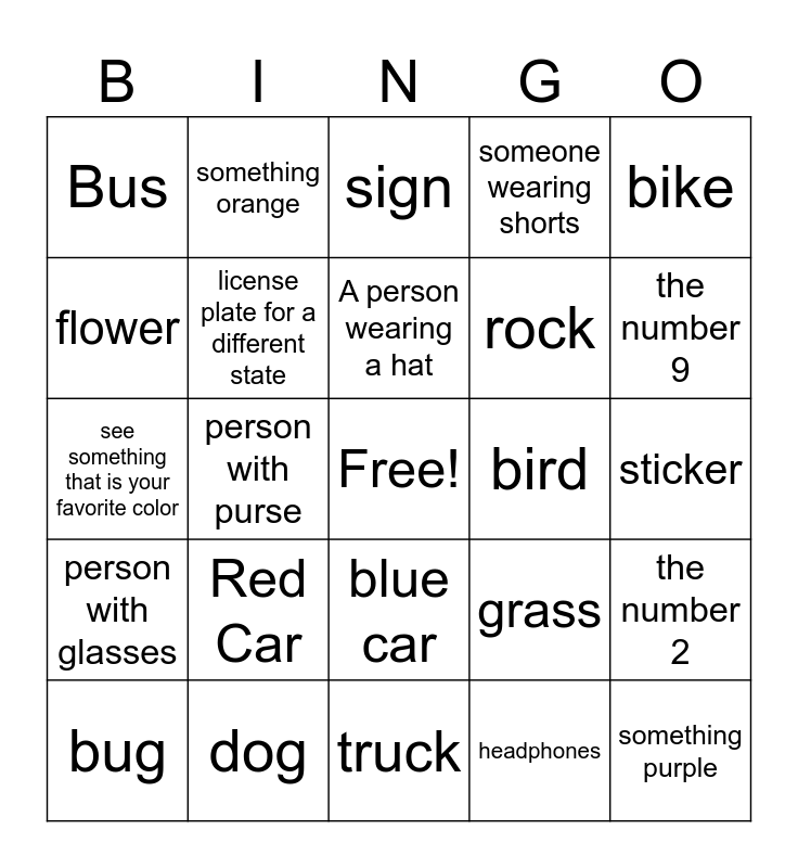 This bingo card has a free space and 24 words: Red Car, dog, A person wearing a hat, bug, bike, Bus, flower, something orange, bird, blue car, rock, see something that is your favorite color, grass, the number 2, license plate for a different state, headphones, sticker, sign, the number 9, person with purse, something purple, person with glasses, someone wearing shorts and truck.