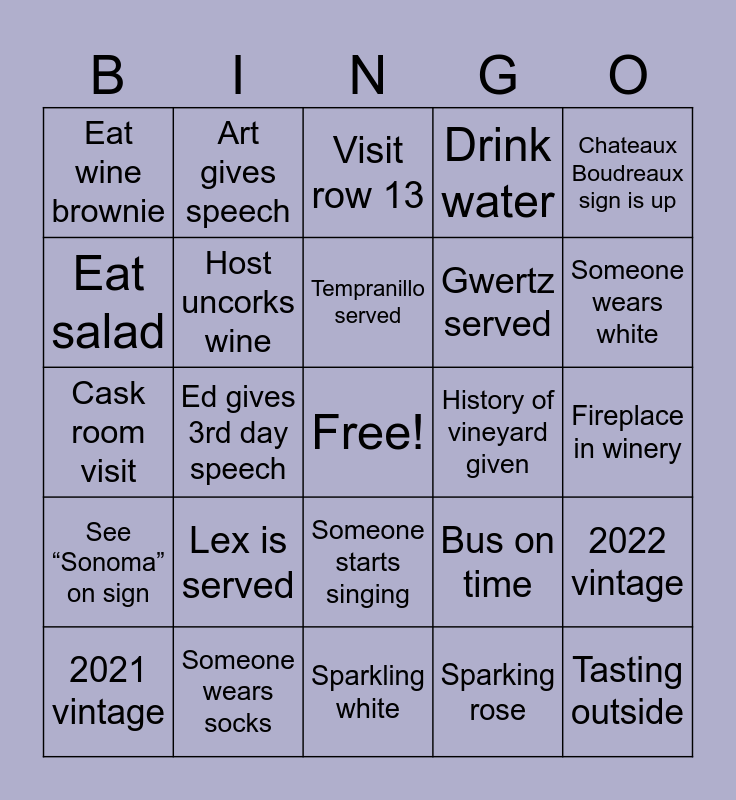 This bingo card has a free space and 29 words: Someone wears purple, Someone wears socks, Visit row 13, Moon Mountain label, Chateaux Boudreaux sign is up, Eat wine brownie, Host uncorks wine, Tempranillo served, History of vineyard given, 2022 vintage, 2021 vintage, Ed gives 3rd day speech, Sparking rose, Tasting outside, Cask room visit, Host says cheers, Sparkling white, Bus on time, Someone wears white, See โSonomaโ on sign, Lex is served, Bus is late, Gwertz served, Fireplace in winery, Eat salad, Art gives speech, Someone starts singing, Drink water and Merlot.