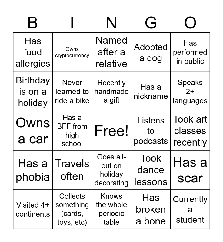This bingo card has a free space and 40 words: Born in January, Owns a car, Never flown on an airplane, Never learned to ride a bike, Collects something (cards, toys, etc), Goes all-out on holiday decorating, Recently handmade a gift, Received an award, Has performed in public, Has a phobia, Has a BFF from high school, Adopted a dog, Currently a student, Took art classes recently, Listens to podcasts, Travels often, Attended a concert recently, Has food allergies, Belongs to a club, Named after a relative, Has a scar, Has broken a bone, Has a nickname, Birthday is on a holiday, Has a bucket list, Makes New Year’s resolutions, Good cook, Met a famous person, Helped a stranger recently, Got help from a stranger, Worked at a family business, Visited 4+ continents, Had a long-distance relationship, Took dance lessons, Speaks 2+ languages, Knows the whole periodic table, Can do basic car repairs, Was in a wedding party this year, Owns cryptocurrency and Climbed a mountain.