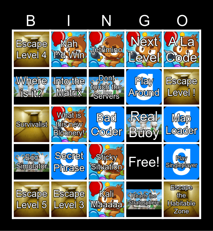 This bingo card has 24 images and 25 words: Secret Phrase, Kali Maaaaa, Dont touch the Servers, Escape Level 5, A La Code, Escape Level 4, Where is it?, Nah I^d Win, Real Buoy, Sticky Situation, Play Around, Survivalist, Free!, Play Singleplayer, Into the Matrix, Escape the Habitable Zone, Map Loader, Tetrimino, Escape Level !, What is this new Bloonery!, Bad Coder, Escape Level 3, Egg Simulator, Next Level and Reach the Stratosphere.