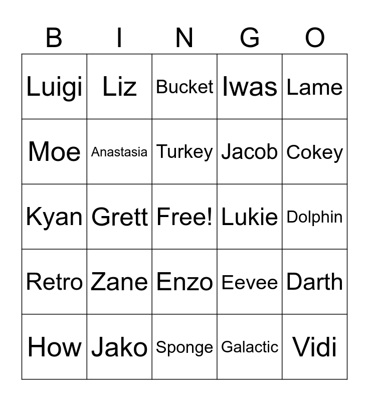 This bingo card has a free space and 24 words: Zane, Jako, Turkey, How, Lame, Luigi, Moe, Liz, Lukie, Enzo, Jacob, Kyan, Eevee, Darth, Anastasia, Galactic, Dolphin, Bucket, Cokey, Grett, Vidi, Retro, Iwas and Sponge.