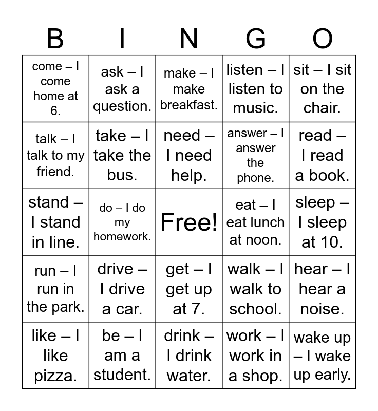 This bingo card has a free space and 30 words: be – I am a student., have – I have a car., do – I do my homework., go – I go to school., come – I come home at 6., make – I make breakfast., take – I take the bus., get – I get up at 7., eat – I eat lunch at noon., drink – I drink water., sleep – I sleep at 10., wake up – I wake up early., work – I work in a shop., study – I study English., read – I read a book., write – I write an email., walk – I walk to school., run – I run in the park., drive – I drive a car., sit – I sit on the chair., stand – I stand in line., say – I say hello., ask – I ask a question., answer – I answer the phone., talk – I talk to my friend., listen – I listen to music., hear – I hear a noise., like – I like pizza., need – I need help. and want – I want a new phone..